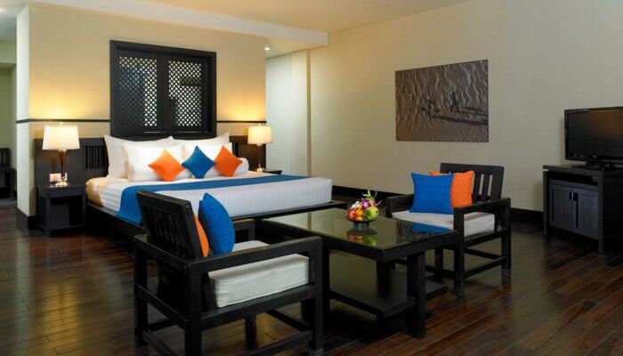 Envuélvete en el lujo suntuoso y espacioso mientras contemplas un impresionante oasis de jardín con sus estanques de loto; vislumbrando el brillo del océano más allá. Siente la suave brisa marina mientras te sumerges en el suave abrazo de una cama de día en tu propio balcón privado y disfruta de la extensión de las noches estrelladas sobre la capa. Ubicado en los pisos superiores de los edificios principales, puede relajarse con estilo y comodidad.