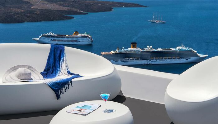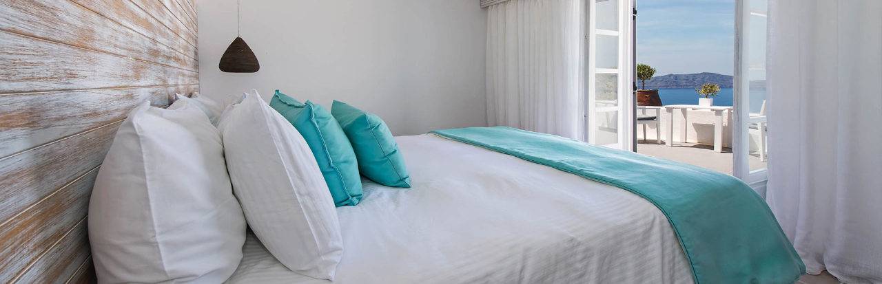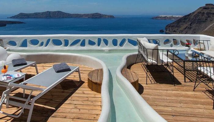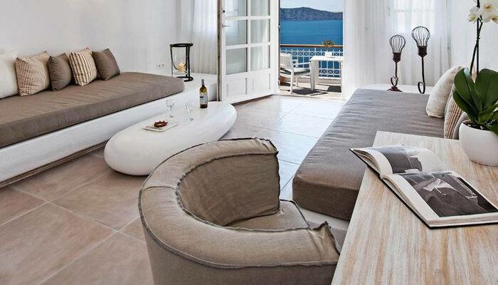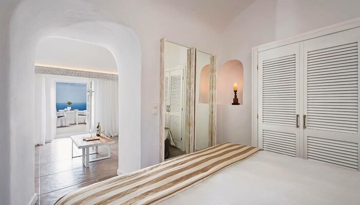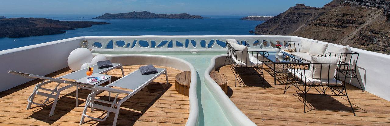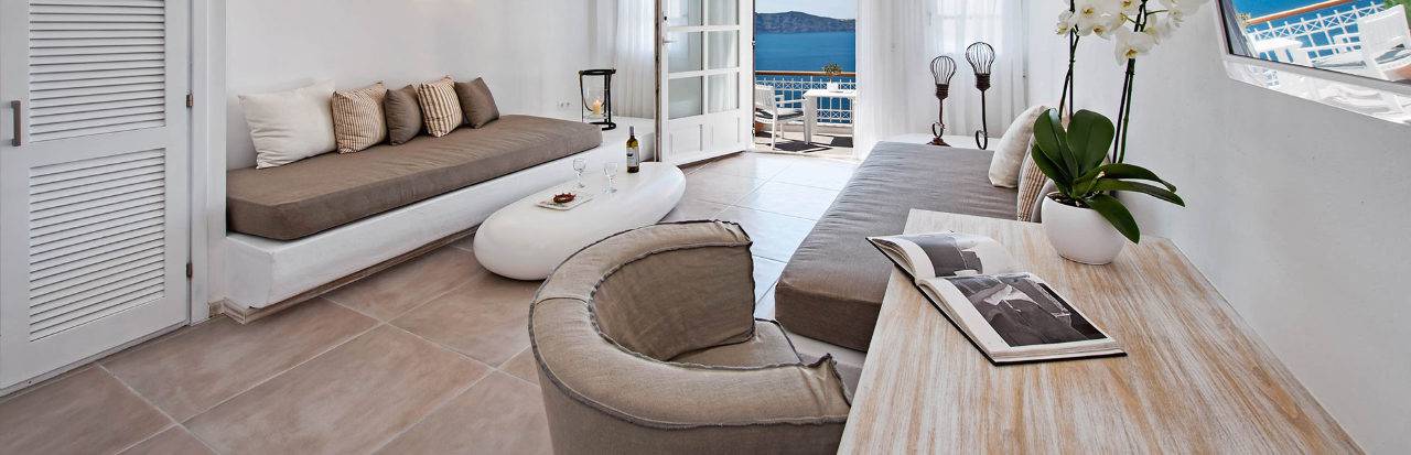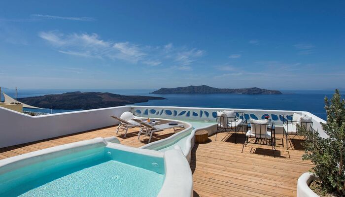 Quizás las suites más exclusivas y elegantes en los acantilados de la Caldera. Capaz de alojar hasta 6 personas con 2 dormitorios principales con baños y un gran salón con un sofá cama doble y un tercer baño. El gran balcón privado con el exclusivo jacuzzi climatizado puede hacer que sus momentos sean mágicos e inolvidables.