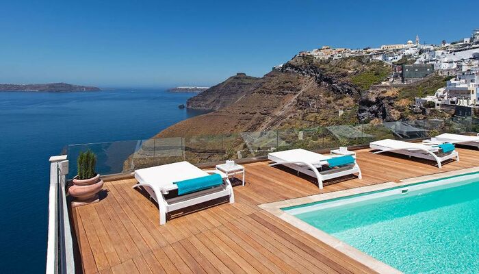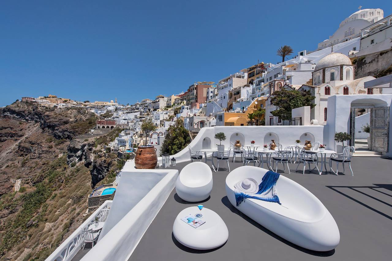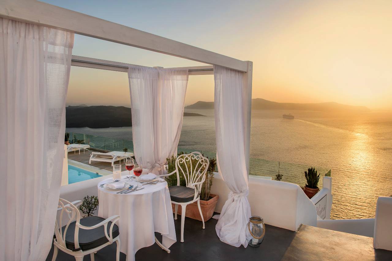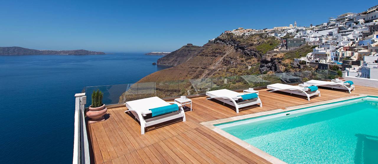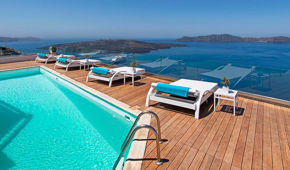 Santorini hotel de lujo en Cícladas, lugar para bodas y resort de luna de miel, isla de Grecia