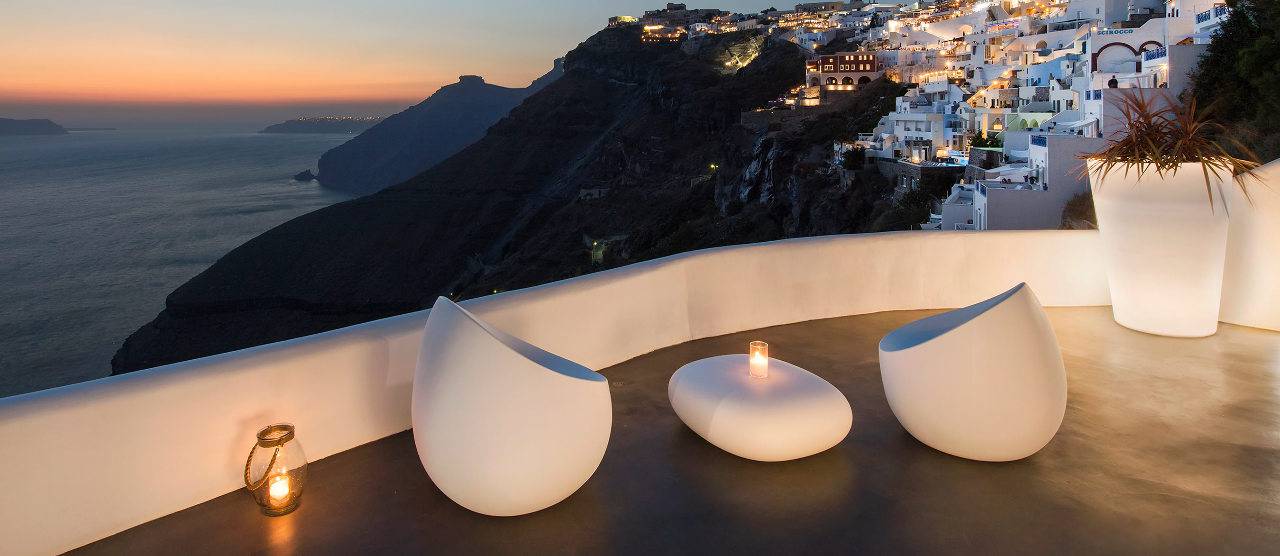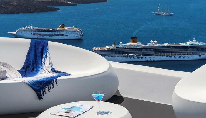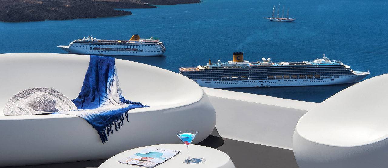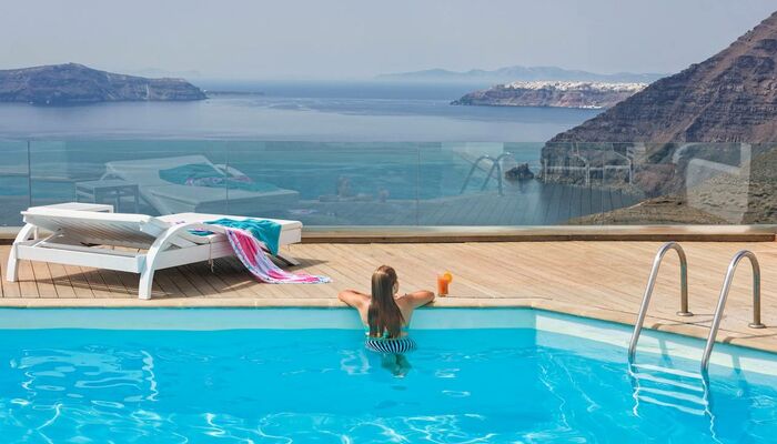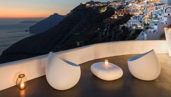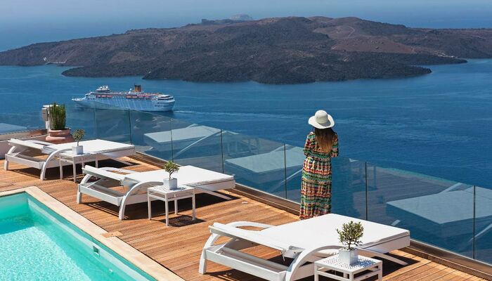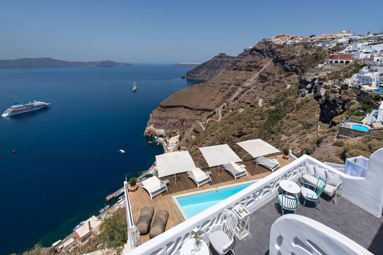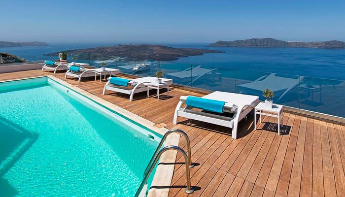 Santorini hotel de lujo en Cícladas, lugar para bodas y resort de luna de miel, isla de Grecia