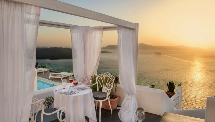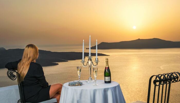 Quizás el lugar más romántico del mundo, Santorini, es el nido ideal para los recién casados y las personas llenas de sentimientos y amor. Nuestro hotel ofrece algunas de las vistas más impresionantes de la caldera, el volcán y la famosa puesta de sol. Sorprenda a su otra mitad con una botella de champán fino a su llegada, un pastel romántico, muchas velas en su suite y un hermoso ramo de flores frescas. Además, este paquete incluye una cena romántica en el restaurante de nuestro hotel (también se puede servir en su balcón) con una botella de vino, aperitivo, ensalada fresca y dos platos principales.