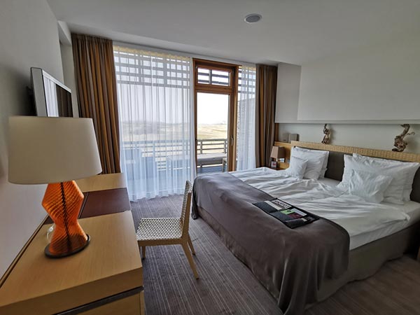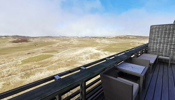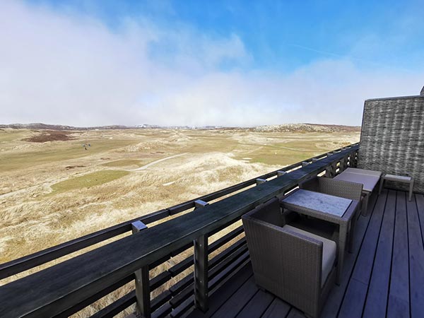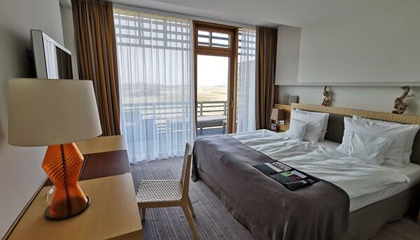 En la cómoda y popular habitación doble de lujo (aprox. 35 m²) con balcón privado, puede disfrutar de una vista sin obstáculos interminable en uno de los cuatro puntos cardinales con vista al Mar del Norte, al galardonado campo de golf o al Hörnum. puerto pequeño.