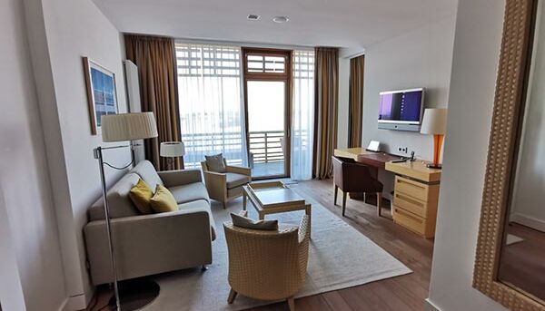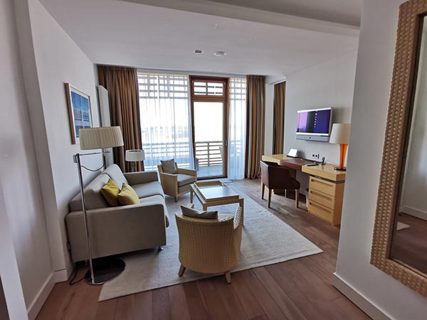 Nuestras lujosas y espaciosas suites junior en tres tamaños diferentes (aprox. 42 m² / 46 m² / 55 m²) con diferentes muebles y hermosas vistas diferentes son ideales para una estadía prolongada. Un amplio balcón le invita a quedarse. Ya sea una pequeña junior suite con vista al mar y al campo de golf o una gran junior suite con vista directa al mar, todas las junior suites tienen una sala de estar y un dormitorio separables con un cómodo sofá con función de cama, así como una ducha de lluvia y Bañera separada en el baño. Algunas de nuestras junior suites con aproximadamente 55 m² están equipadas con una pequeña cocina y una amplia mesa de comedor en la sala de estar y algunas tienen un gran vestidor y un bidé adicional en el baño.
