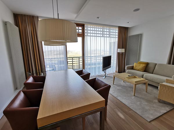 Todas las suites ofrecen una sala de estar y un dormitorio separables con una cama king-size (2,20 m) y un cojín princesa adicional, aire acondicionado, una sala de estar con una amplia zona de estar y un cómodo sofá con función de cama, así como una pequeña pequeña cocina (sin fogones) y una gran mesa de comedor.