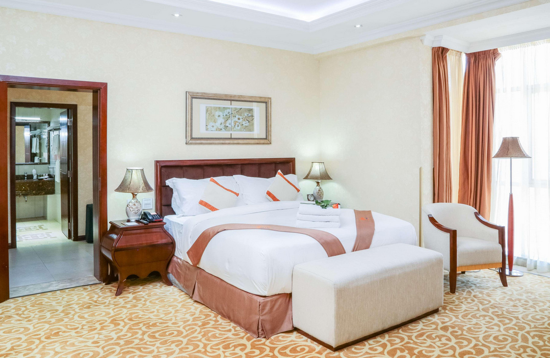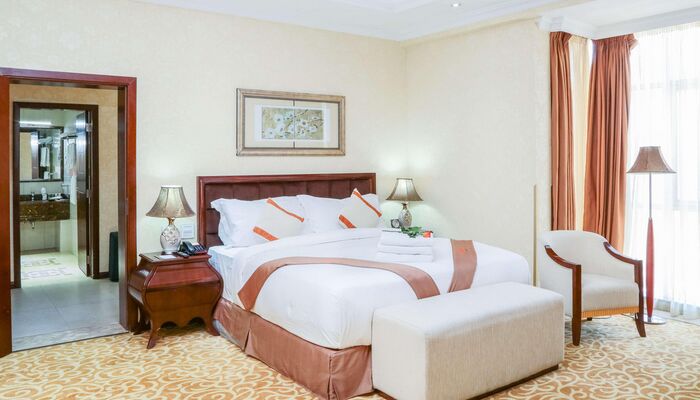 Espléndida y acogedora habitación de amplia cama con vestidor independiente en pasillo. Decorado con un exquisito diseño interior y completas amenidades, balcón privado, jacuzzi, acceso a Internet alámbrico e inalámbrico, televisión satelital y mini bar. Además de una elegante sala de estar y un baño adicional para invitados.