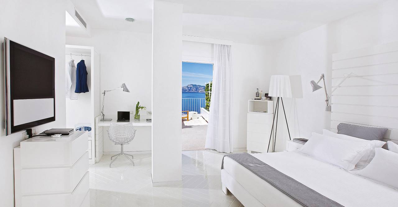 En Casa Angelina nuestras habitaciones y suites son exquisitamente contemporáneas, las líneas limpias y el mobiliario blanco compensan las impresionantes vistas del Golfo de Salerno y la costa de Amalfi. Sumérjase en el lujo del lujo con camas profundamente cómodas envueltas en suaves sábanas de algodón blanco de Bellora, generosos baños completamente equipados con artículos de tocador l`Occitane y una especificación técnica que incluye televisores de pantalla plana Bang & Olufsen y acceso gratuito a internet wi-fi e incluso - en algunas habitaciones: bases para iPod, computadoras portátiles para uso de los huéspedes y cafeteras Nespresso.
