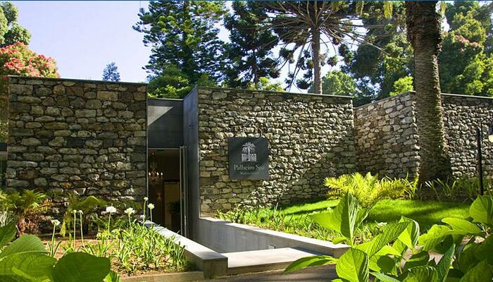Cepillando la fachada de piedra seca hay bancos de frondosos helechos y agapantos que estallan en un resplandor de lilas durante los meses de verano. La cantaria gris pulida (piedra de basalto que enmarca las puertas y ventanas) acentúa aún más la apariencia orgánica del spa. Arriba, el pino canario, los candelabros y otros árboles exóticos se agrupan en abundancia.