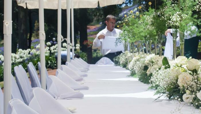 La vajilla de plata pulida y la vajilla de Villeroy & Boch con motivos de flores pequeñas ejemplifican la atención al detalle. Los aerosoles de flores frescas agregan color y fragancia.