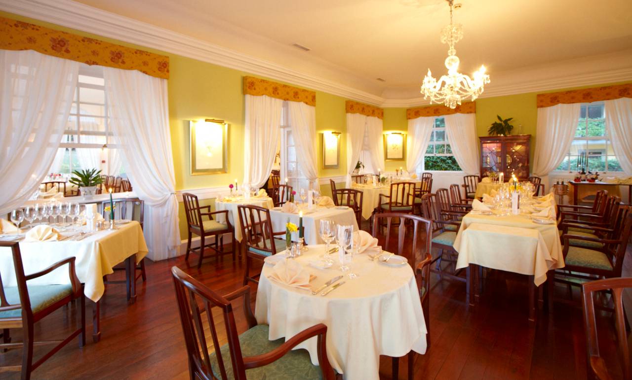 El comedor en Madeira Island Hotel Casa Velha do Palheiro domina los jardines y el césped bien cuidado en la parte trasera de la propiedad de cinco estrellas.