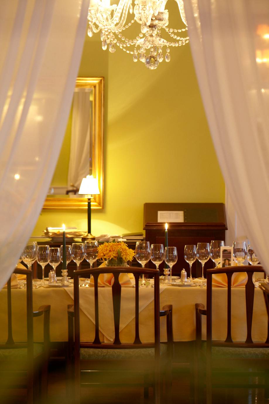 Cuando cae la noche, las luces se bajan y una atmósfera más formal impregna la habitación.